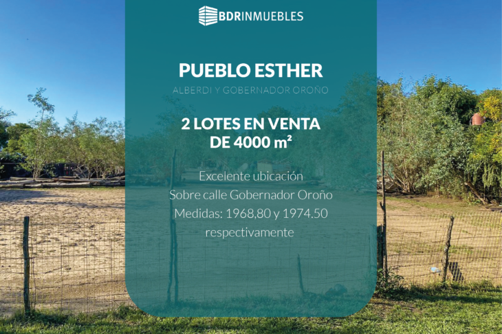 Excelente ubicación: a metros de Ruta. sobre calle Gobernador Oroño (Alberdi). 2 lotes contiguos. Medidas: 1968,80 y 1974.50 respectivamente. Altura máxima para construir: 9 m2. Retiro obligatorio: 4 m2. Frente Escuela técnica . Acceso fluído. Opción de venta juntos o separados.